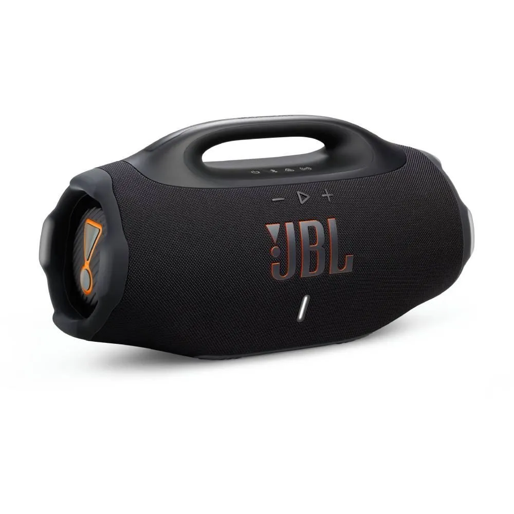 A Boombox 4 mantém o visual robusto e imponente da geração anterior, mas agora traz um logotipo metálico no centro e acabamento ainda mais refinado.